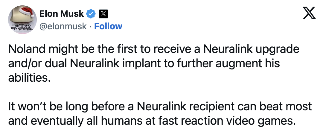 Neuralink的升级实验将采用“双植入”的方案,首位人类受试者Noland Arbaugh预计将成为首个接受二次手术的患者。